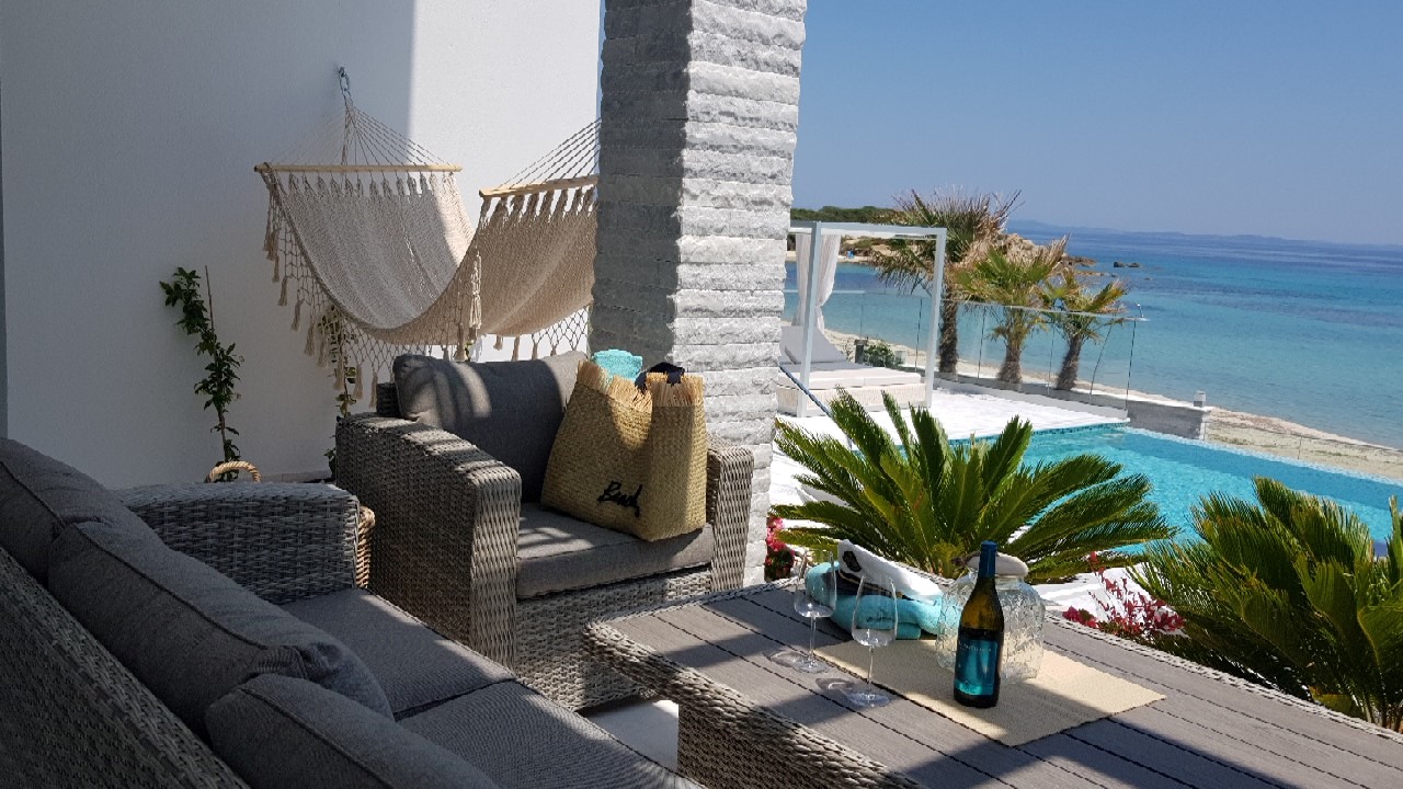 Проект "Иро" В Криарици был создан для продажи.Двухэтажная вилла имеет площадь 150 кв.м. На первом этаже расположены просторная гостиная с двусветным пространством, столовая, кухня, одна спальная комната и санузел. На втором этаже расположены 3 спальные комнаты с отдельными санузлами и балконами. Хозяйская спальня имеет панорамные окна с восхитительным видом на Афон, а также ванную комнату с видом на море. На участке есть бассейн с джакузи и переливами, комфортная диванная зона около бассейна, организованные площадки и цветочные гластры, площадка для паркинга при въезде на участок.