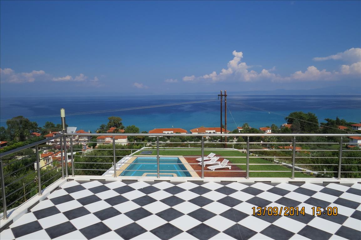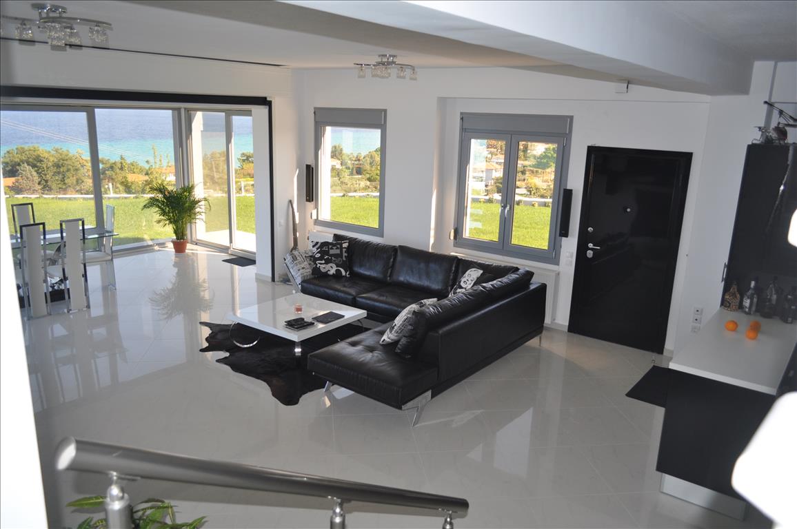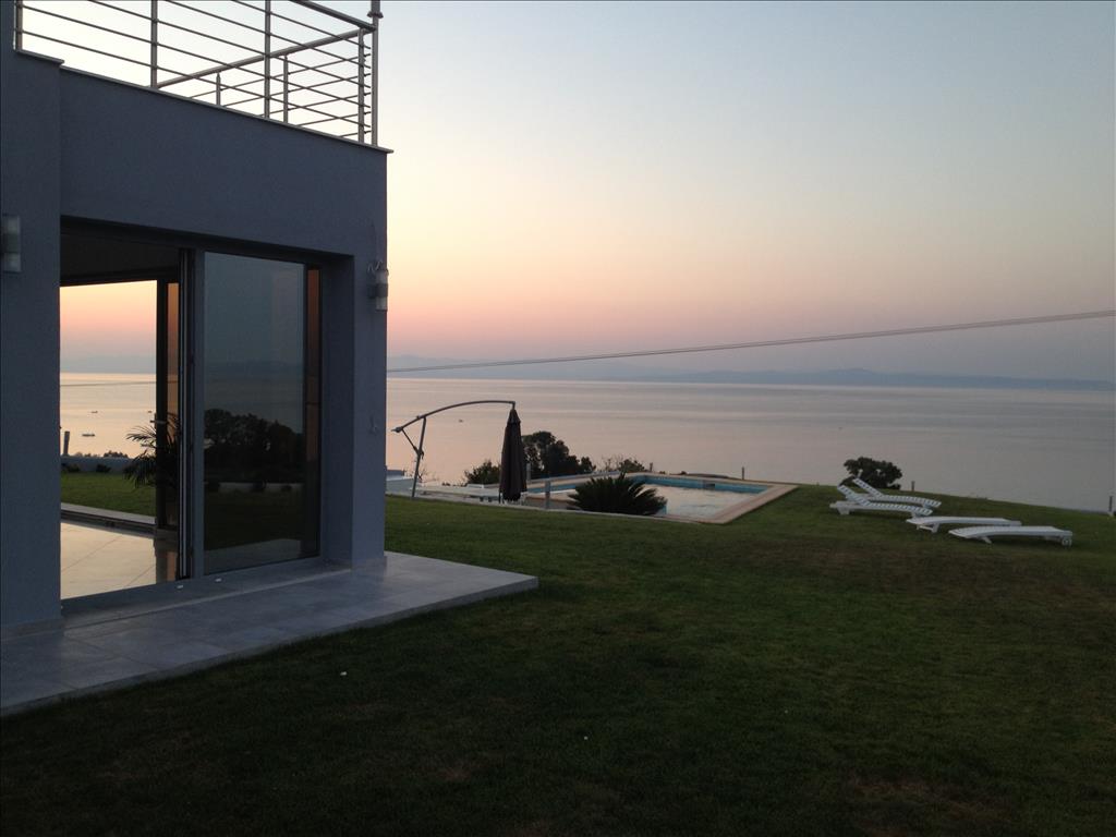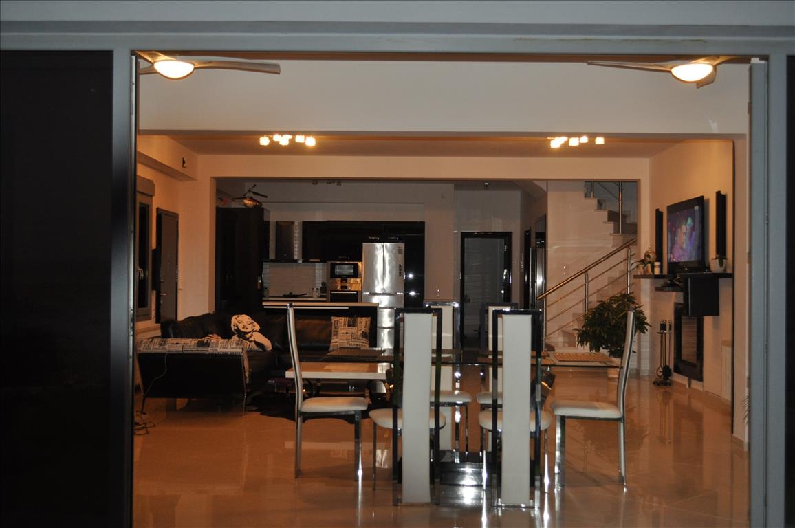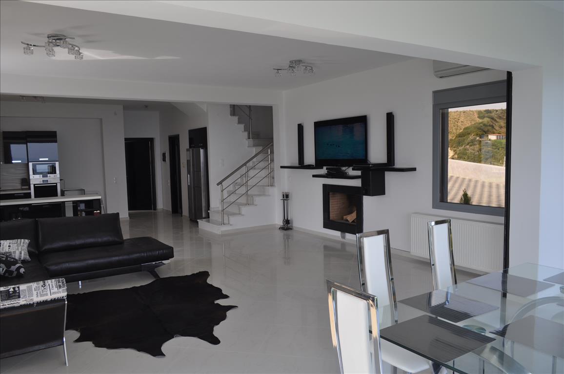 Поселок, в котором расположена вилла, является популярным курортным местечком с многокилометровым пляжем и развитой инфрастуктурой. Дом полностью меблирован в красивом минималистическом стиле, оснащен бытовой техникой(телевизоры в 3-ех комнатах, кухонная мебель с бытовой техникой фирмы BOSCH, 2 больших холодильника, посудомоечная и стиральная машина, спутниковое телевидение и т.д.). К дому прилегает большой участок площадью 900 кв.м, покрытый зеленым газоном, который поливается автоматически. Территория участка освещается. Имеется открытая стоянка для машины на 3 места. Расстояние от моря 800 м, а от аэропорта г. Салоники 85 км.