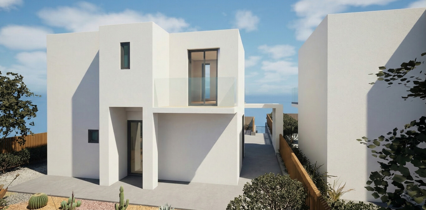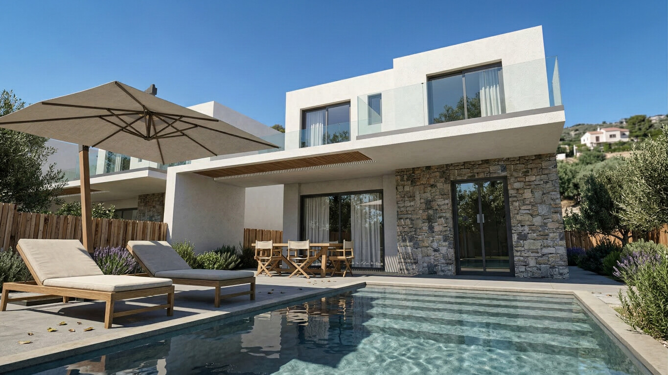 A newly built villa is for sale within walking distance from the sea, in Ammoudara, Lassithi, in eastern Crete. The villa offers sea and mountain views, short distance from shops and other amenities as well as the beach and finally offers great rental potential. Its interior has an area of ​​80 sq m and consists of a ground floor and a 1st floor. On the ground floor we find an open plan living room with kitchen and a guest WC. On the 1st floor we find 2 bedroom with balconies and 1 bathroom. The outdoor area is approximately 340 sq m of exclusive use, fenced with a private swimming pool and parking.